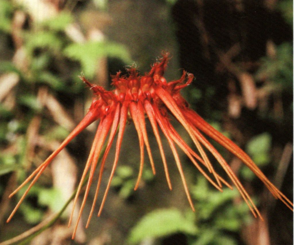 The variety puniceum differs in the ovate-conic pseudobulbs and the vermillion colored flowers.