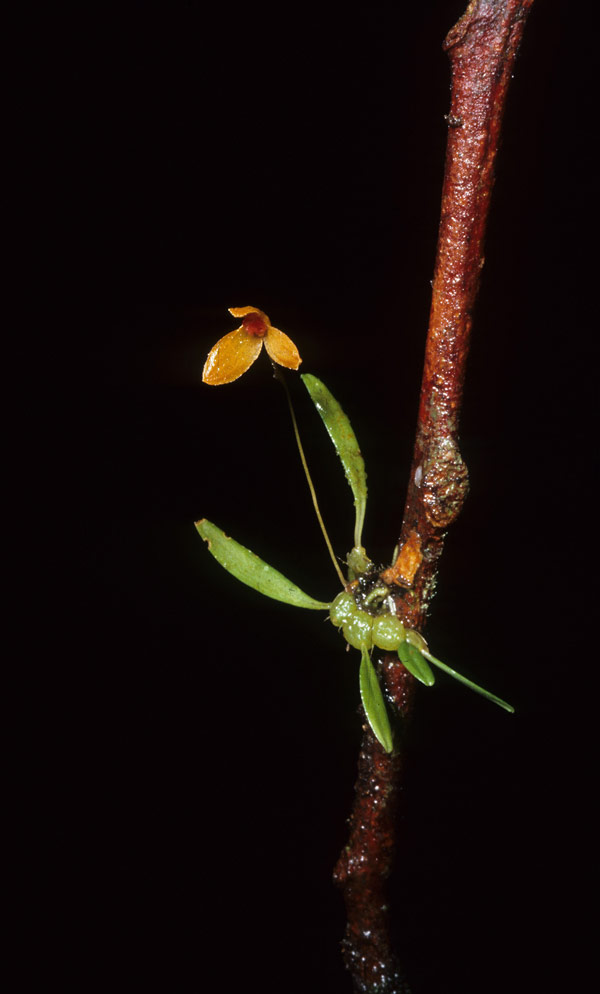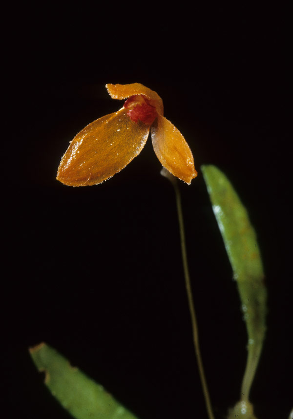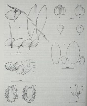 Found in Sabah Borneo in lower to upper wet montane forests at elevations of 1400 to 2000 meters as a mini-miniature sized, warm to cool growing epiphyte with close set, ovoid, somewhat flattened pseudobulbs carrying a single, apical, erect, rather thin, elliptic to obovate, obtuse, gradually narrowing below into the petiolate base leaf that blooms in the spring, summer and early fall on an erect, basal, 1 to 1.6" [2.5 to 4 cm] long, single flowered inflorescence with a tubular floral bract.