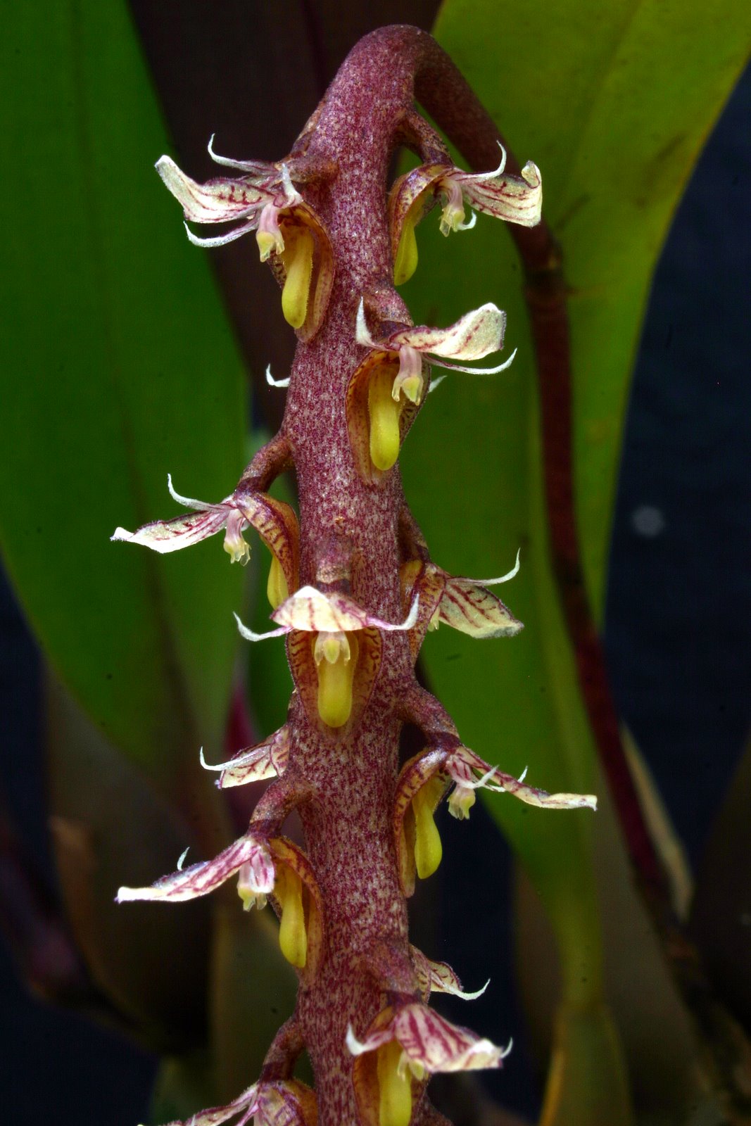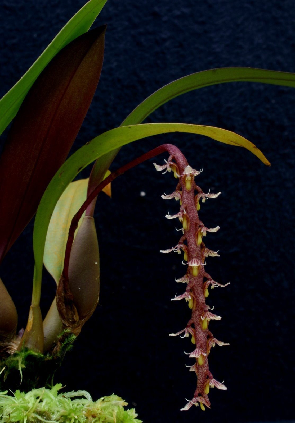 Found in Sulawesi in mossy montane forests at elevations around 1400 to 1500 meters as a small sized, cool growing epiphyte with 1/2 to 3/4" [1.2 to 1.8 cm] between each loosely clustering, ovoid, olive green pseudobulbs carrying a single, apical, erect, dark green, elliptic, acute, gradually narrowing below into the petiolate base leaf that blooms in the spring on a basal, patent, 3.6" [9.2 cm] long, peduncle and rhachis densely mottled purplish red, rather densely 18 flowered, racemose, rachis somewhat nodding, slightly thickened, cylindrical inflorescence with acute floral bracts and carrying non resupinate, mostly simultaneously opening flowers .