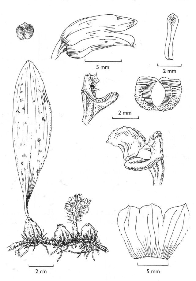 Found in the Philippines on the island of Palawan at elevations around 1000 meters as a miniature sized, warm to cool growing epiphyte with a short rhizome giving rise to irregularily globose, sulcate pseudobulbs enveloped by small, basal sheaths and carrying most often 1, occasionally 2, apical, broadly elliptic, acute, suffused with red, leathery, thick, stiff, sessile base leaves that blooms in the fall on an erect, to .84" [2.1 cm] long, with 3 to 4 alternating bracts enveloping the base of each flower, to 12 flowered inflorescence with lanceolate-ovate, acuminate floral bracts and carrying greenish in youth becoming purplsh with age flowers.
