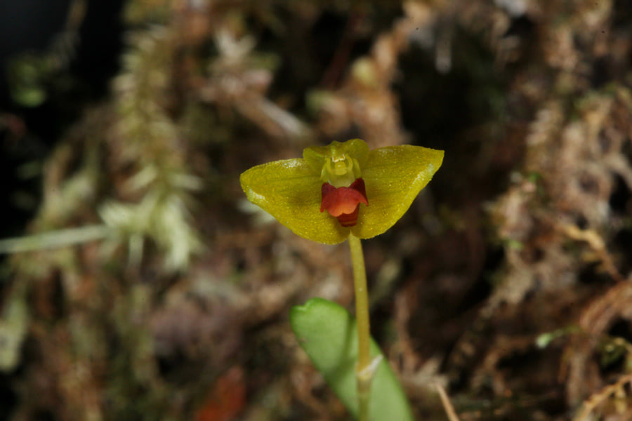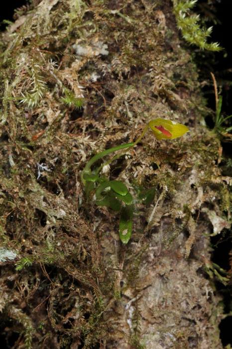 Found in Sabah Borneo in wet primary forests at elevations of 1200 to 2000 meters as a mini-miniature sized, cool growing epiphyte with a creeping rhizome giving rise to close set, ovoid, somewhat flattened to not pseudobulbs carrying a single, apical, erect, ovate to elliptic, obtuse, petiolate base leaf that blooms in the spring and summer on a basal, peduncle .24 to .76" [.6 to 1.9 cm] long, provided with 2 to 3 scales, .6 to 1.4" [1.5 to 3.5 cm] long overall, single flowered inflorescence with much shorter than the ovary floral bracts.