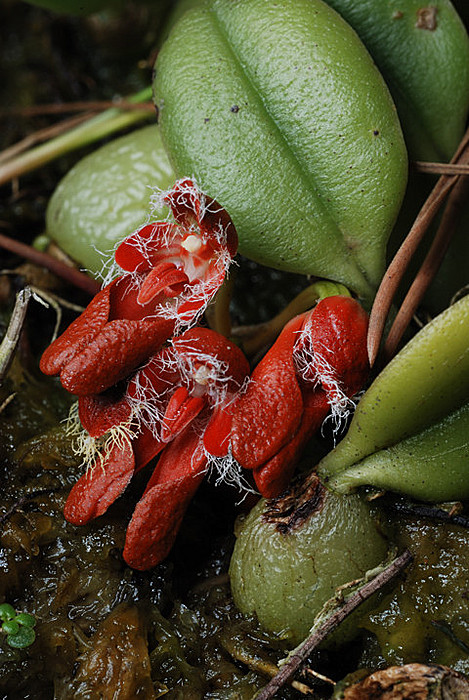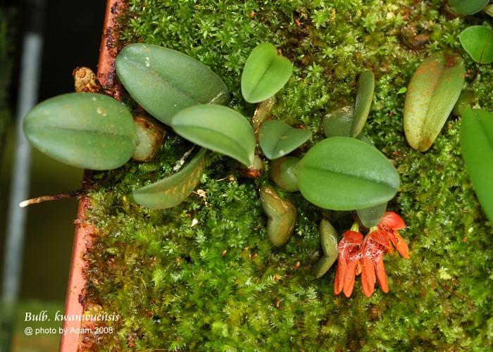 Found in southern Taiwan in chamaecyparis forests on mountain ridges at elevations around 1800 to 2150 meters as a mini-miniature sized, cool to cold growing epiphyte with a creeping rhizome that has to .4 to .8" [1 to 2 cm] between each globose to ovoid pseudobulb carrying a single, more or less elliptic to obovate, rounded to slightly retuse apically, gradually narrowing below into the sessile base leaf that blooms in the spring on a basal, erect, .8 to 1.2" [2 to 3cm] long, 3 to 7 flowered, umbellate inflorescence with 2 scale-like sheaths.