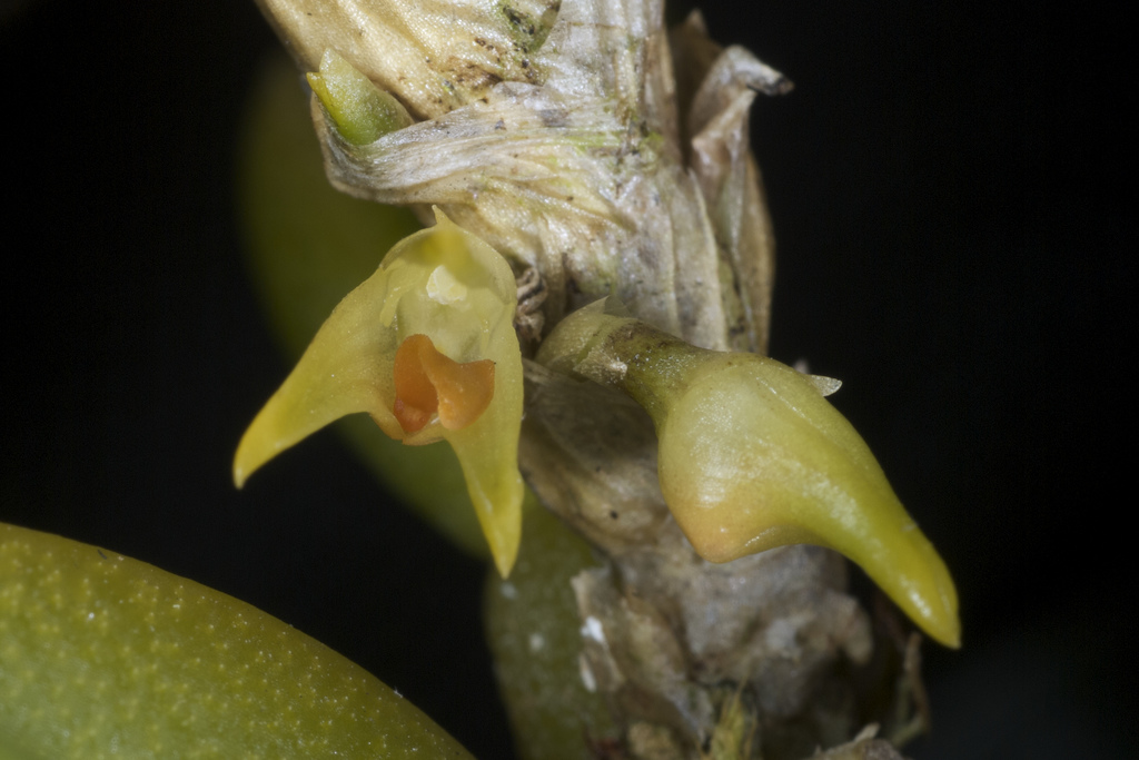 Found in Queensland Australia in rainforests on small trees and rocks at elevations of 800 to 1200 meters as a mini-miniature sized, warm to coolgrowing epiphyte or lithophyte with a pendulous, sparsely branched stem carrying well spaced, pale to dark green, naked, ovoid pseudobulbs carrying a single, apical, stalkless, fleshy, broadly and shallowly grooved, pale to dark green leaf that blooms in the fall and winter on a, horizontal, .1 to .15" [2 to 3 mm] long, single flowered inflorescence.