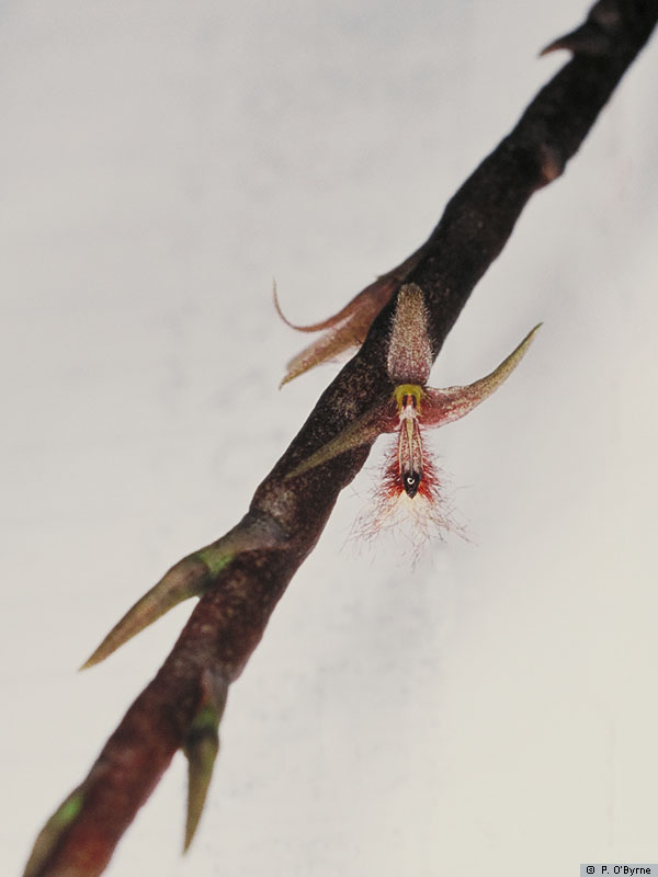 Found in Thailand as a miniature sized epiphyte with globose, squashed flat, pseudobulbs carrying a single, apical, erect, coriaceous, elliptic, acute, gradually narrowing below in to the elongate, petiolate base leaf that blooms in the later spring on a basal, pendant, 7" [17.5 cm] long, short wooly, few opening successively several flowered inflorescence.