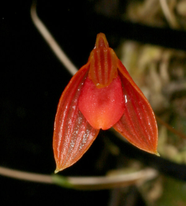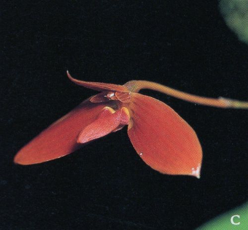Found in Sabah Borneo near Mt Kinabalu in montane forests at elevations of 1300 to 2100 meters as a mini-miniature sized, warm to cold growing, creeping epiphyte with ovoid to ellipsoid slightly flattened pseudobulbs carrying a single, apical, erect, rather thick, ovate to elliptic, abruptly narrowing below into the shortly petiolate base leaf that blooms in the spring and summer on a basal, erect, 1 to 1.8" [2.5 to 4.5 cm] long, single flowered inflorescence with a tubular floral bract and flowers without a scent.