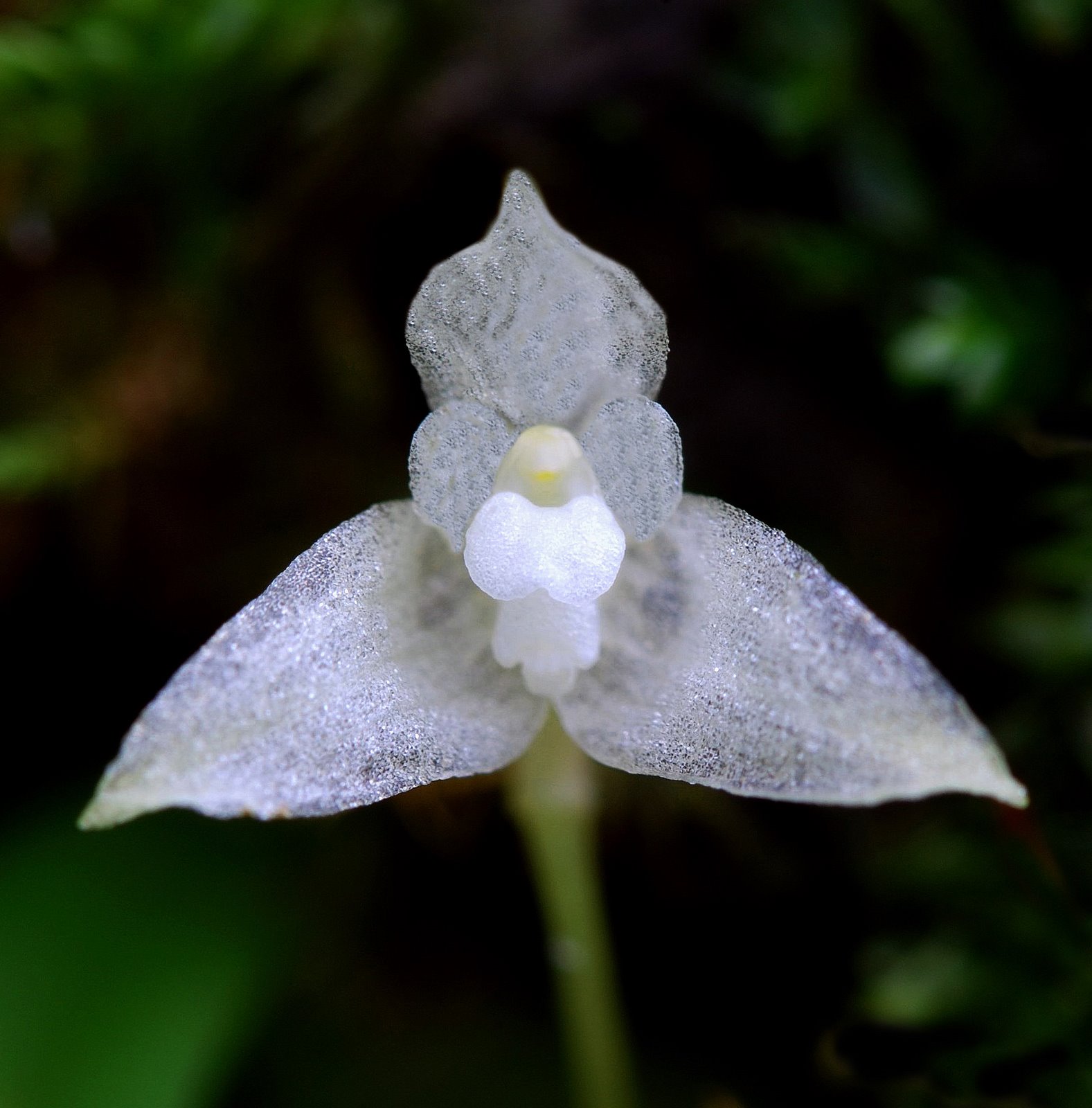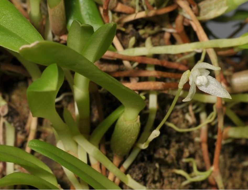 Found in New Guinea in lower montane primary forests at elevations of 200 to 1400 meters as a miniature sized, hot to warm growing epiphyte with .32" to 4" [.8 to 10 cm] between each, ovoid to ellipsoid, hardly flattened pseduobulbs carrying a single, ovate to elliptic, obtuse to acute, gradually narrowing below into the shortly petiolate base leaf that blooms in the late spring and summer on a basal, usuallu single, rarely a few together, .6 to 1.4" [1.5 to 3.5 cm] long, single flowered inflorescence with elliptic, tip acute to subacute, longer than the ovary floral bracts.