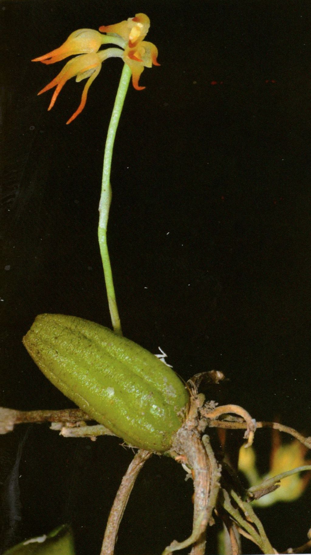 Found in southern Hainan Island of China in forests on rocks as a mini-miniature sized, cool growing lithophyte with a creeping, branching rhizome with [1 to 4 cm] between each cylindric to ellipsoid pseudobulbs carrying a single apical, erect, oblong, leathery, obtuse-rounded and slightly emarginate apically, contracted below into the shortly petiolate base leaf that blooms in the late spring through earlly fall on 1 to 2, basal or from the nodes on the rhizome, erect, slender, .4 to .8" [1 to 2 cm] long, umbel-like, 2 to 5 flowered inflorescence with oblong, small, acuminate floral bracts