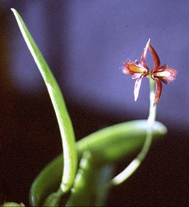 Found in Cameroon without locational data as a mini-miniature sized epiphyte with ovoid, obtusely 4 angled pseudobulbs carrying a single, apical, linear-oblong, obtuse, rounded, below into the supetiolate base leaf that blooms in the later spring on a filiform, arcuate, provided with 3 sheaths, 1.4" [3.5 cm] long, subumbellate, 2 flowered infloresscence with distichous, oblong-elliptic, acute, ampexicaul floral bracts and carrying non-resupinate, fleshy flowers.