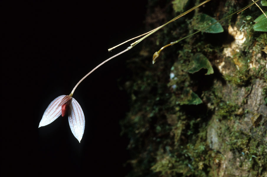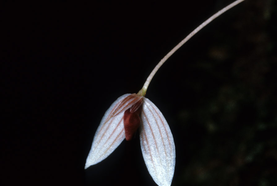 Found in Sabah Borneo in high primary forests at elevations of 1300 to 1500 meters as a mini-miniature, cool growing epiphyte with a creeping rhizome giving rise to close set, ovoid, flattened pseudobulbs carrying a single, apical, erect, elliptic to obovate, obtuse, shortly petiolate base leaf that blooms in the fall on a descending, peduncle to 1.8" [4.5 cm] long, 2.6" [6.5 cm] long overall, single flowered inflorescence with tubular, mush shorter than the ovary floral bracts.