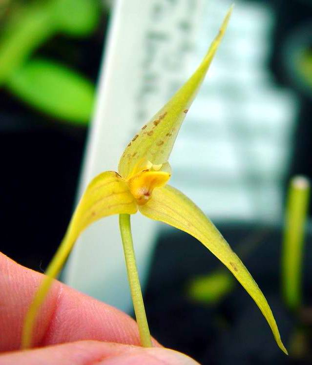 A rare species from Papua and New Guinea at elevations around 2200 to 2300 meters as a mini-miniature to miniature sized, cold growing epiphyte with a creeping rhizome giving rise to cylindrical or narrowly obovoid, 1 to 1.32" [2.5 to 3.3 cm] apart, somewhat flattened pseudobulbs carrying a single, apical, erect, elliptic to obovate to ovate, obtuse, shortly petiolate base leaf that blooms in the winter on a Peduncle 4.0-4.5 cm; provided with 3, the longest c. .24" [6 mm], acute bracts, 3.6 to 4.8" [9 to 12 cm] long overall, single flowered inflorescence with tubular, cuspidate floral bracts.
