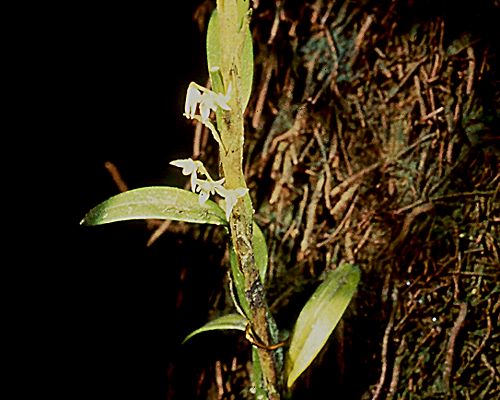Found in New Guinea on trees in forests at elevations around 1100 meters as a miniature to small sized, warm growing epiphyte with subparellel to the rhizome, conical-cylindrical pseudobulbs carrying a single apical, erect, linear, apiculate, narrow base leaf that blooms in the late winter and spring on a thin, short, laxly 2 to 4 flowered inflorescence