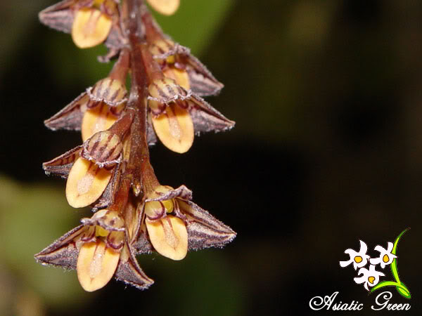 Found in Myanmar, Thailand, Malaysia, Borneo and Sumatra in rainforest and in low and open kerangas foresta at elevations of 500 to 600 meters as a miniature sized, warm growing epiphyte with a creeping and branching rhizome with 2.8 to 4" [7 to 10 cm] between each, shortly conical, appearing squashed, round from above pseudobulbs carrying a single, apical, erect, oblong-lanceolate, acute, narrowing below into the petiolate base leaf that blooms in the winter on a basal, erect, peduncle 2 to 6.6" [5 to 16.5 cm] long, provided with 5 to 6 bracts, wiry, brownish violet, rhachis not thickened, .56 to 4" [1.4 to 10 cm] long, glabrous, simultaneously many, 7 to 22 flowered inflorescence with triangular, acute, not clasping the rachis, purple, shorter than the ovary floral bracts