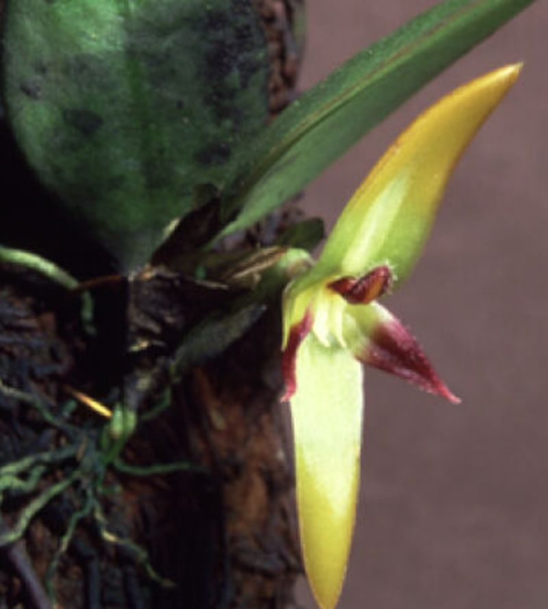 Found in western New Guinea in upland forests at elevations around 2145 meters as a miniature sized, cold growing epiphyte with a short rhizome giving rise to close set, very small, depressed globise to subglobose pseudobulbs carrying a single, apical, erect, obovate-oblong to oblanceolae, obtuse to sometimes acute, fleahy, longitudinally grooved above, gradually narrwoing below into the base leaf that blooms on several, from the rhizome, peduncle warty, longitudinally grooved, obliquely thickened, clavate apex, very short, provided with sheaths, single flowered inflorescence with funnel-shaped, clasping, acuminate, membranous, apically reflexed, longer than the ovary floral bracts