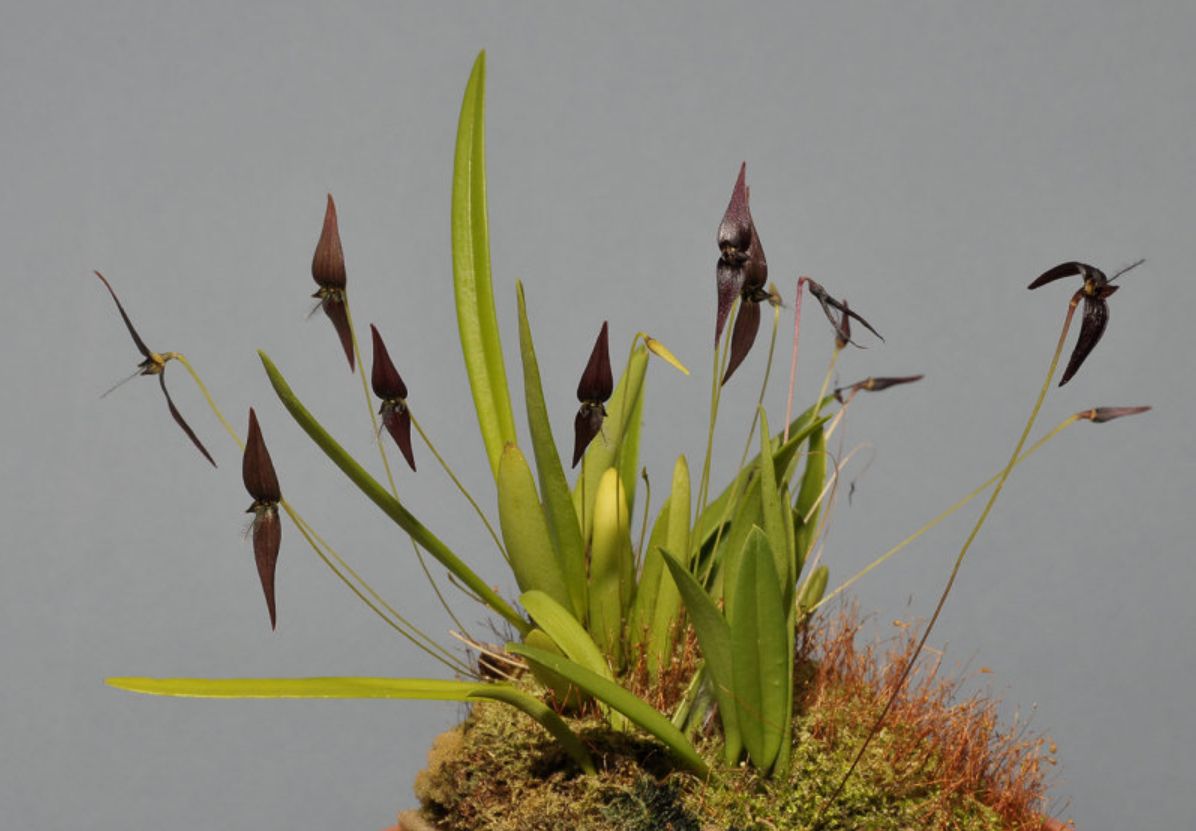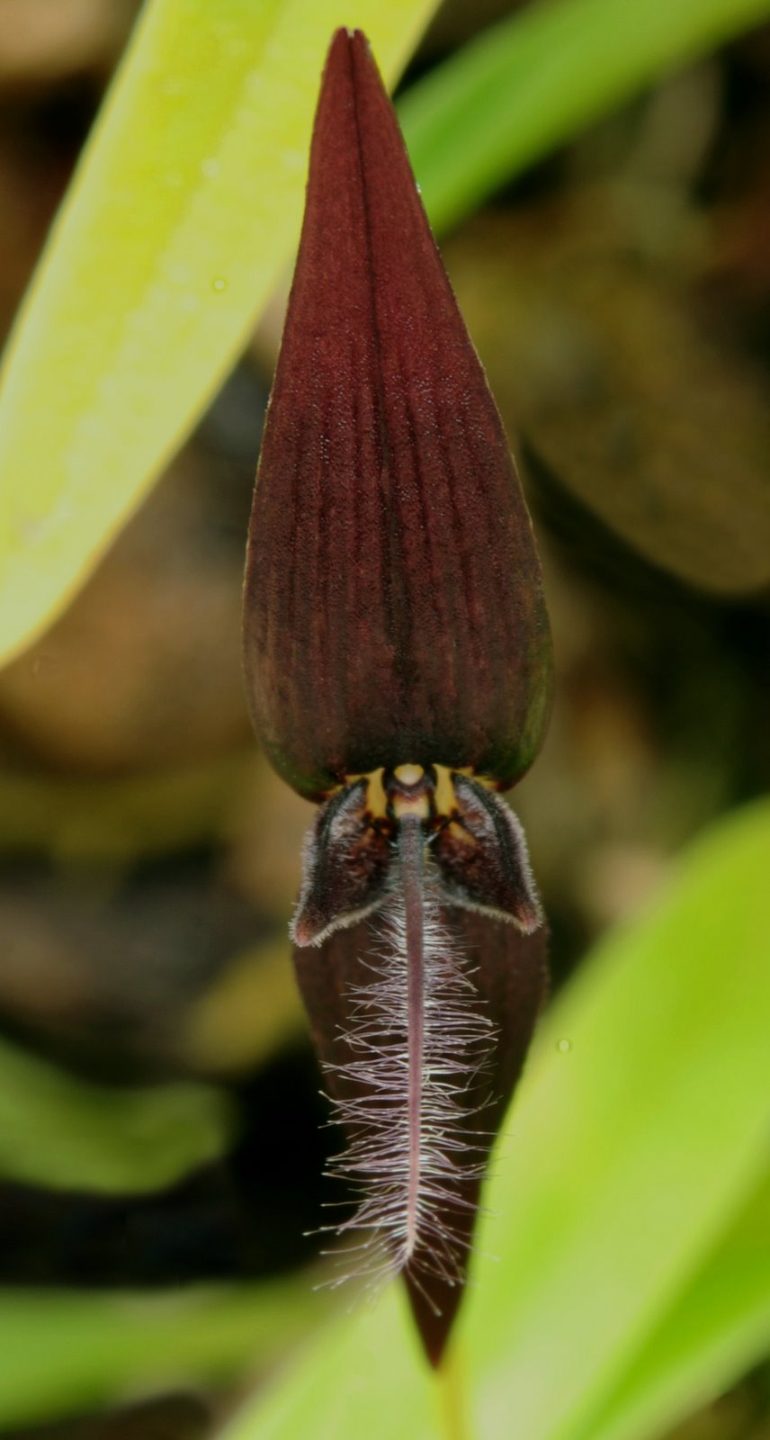 Found in the Moluccas and New Guinea in primary forests at elevations around 200 meters as a mini-miniature sized, hot growing epiphyte with oblong-conical pseudobulbs carrying a single, apical, erect, oblanceolate-ligulate, subapiculate, narrowing below into the base leaf that blooms in the late winter on a filiform, 2" [5 cm] long, single flowered inflorescence carrying the inverted flower at or above the the leaves
