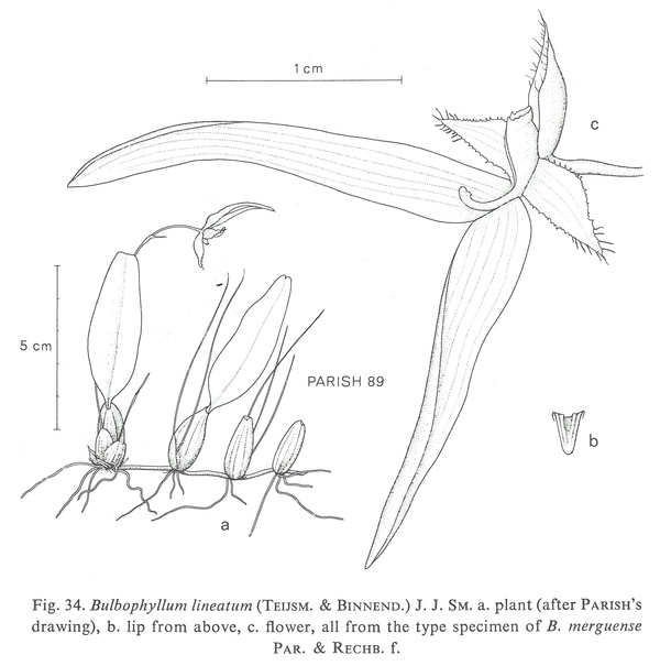 Synonyms Bulbophyllum merguense C.S.P.Parish & Rchb.f. 1874; *Cirrhopetalum lineatum Teijsm & Bin 1862; Phyllorkis merguensis (C.S.P.Parish & Rchb.f.) Kuntze 1891