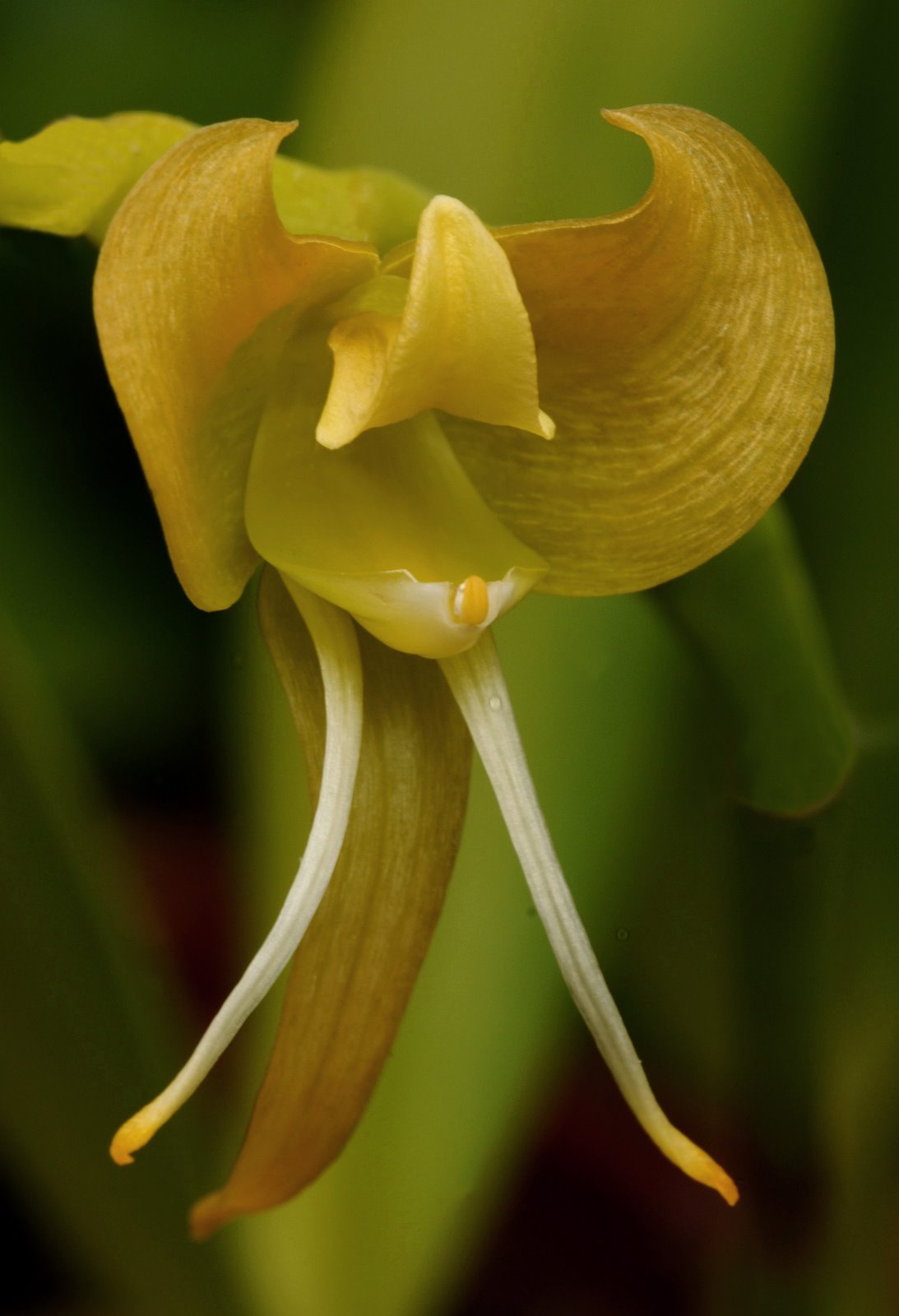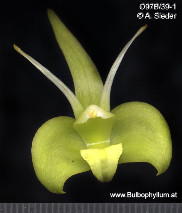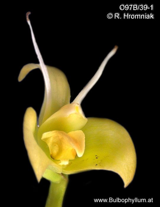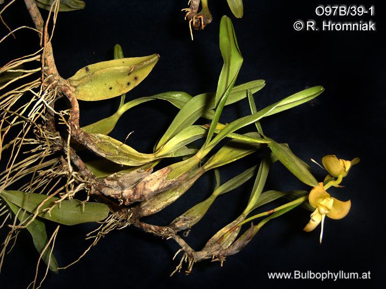 Found in Sao Tome Island in evergreen forest at elevations of 1350 to 1400 meters as a small sized, cool growing epiphyte with 2 to 3 1/4" [5 to 8 cm] between each, ovoid, yellow green, 4 to 6 angled pseudobulb carrying 2 apical, narrowly lanceolate, petiolate leaves and blooms on a basal, 10" [25 cm] long, 3 to 10 flowered inflorescence with a somewhat swollen and compressed rachis and carrying distichous flowers arising on midline of the compressed side of the rachis