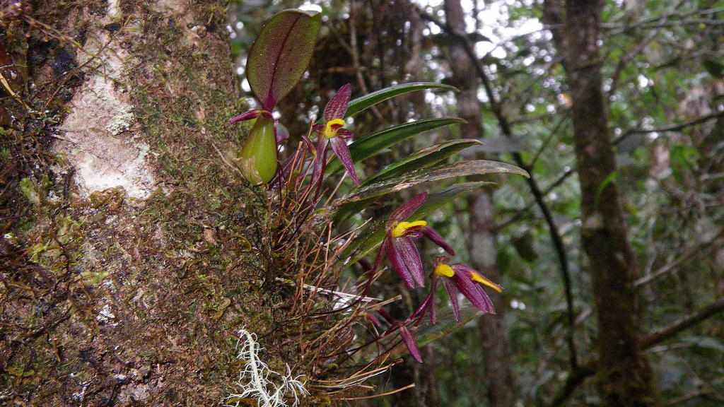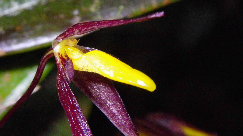 Found in Sabah Borneo in high montane forests often on small branches near the forest floor at elevations of 1600 to 2300 meters as a mini-miniature sized, cool to cold growing epiphyte with 1/4 to 1/2" [7mm to 1.25 cm] between each, ovoid hardly flattened, green stained purple pseudobulbs carrying a single, apical, elliptic, red stained beneath, acute, gradually narrowing below into the petiolate base leaf that blooms in the late spring through early fall on a horizontal, single flowered inflorescence.