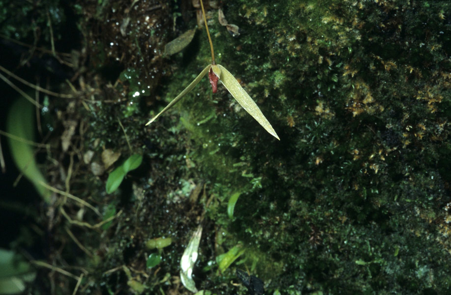 Found in Sabah and Kalimantan Borneo in lowland to wet mossy upper montane forests at elevations of 250 to 1700 meters as a mini-miniature sized, warm to cool growing epiphyte with close set, ovoid, somewhat flattened pseudobulbs carrying a single, apical, erect, rather thin, elliptic, obtuse, gradually narrowing below into the petiolate base leaf that blooms in the spring, summer and early fall on an erect, basal, 1.4 to 2.4" [3.5 to 6 cm] long, single flowered inflorescence with a tubular floral bract.