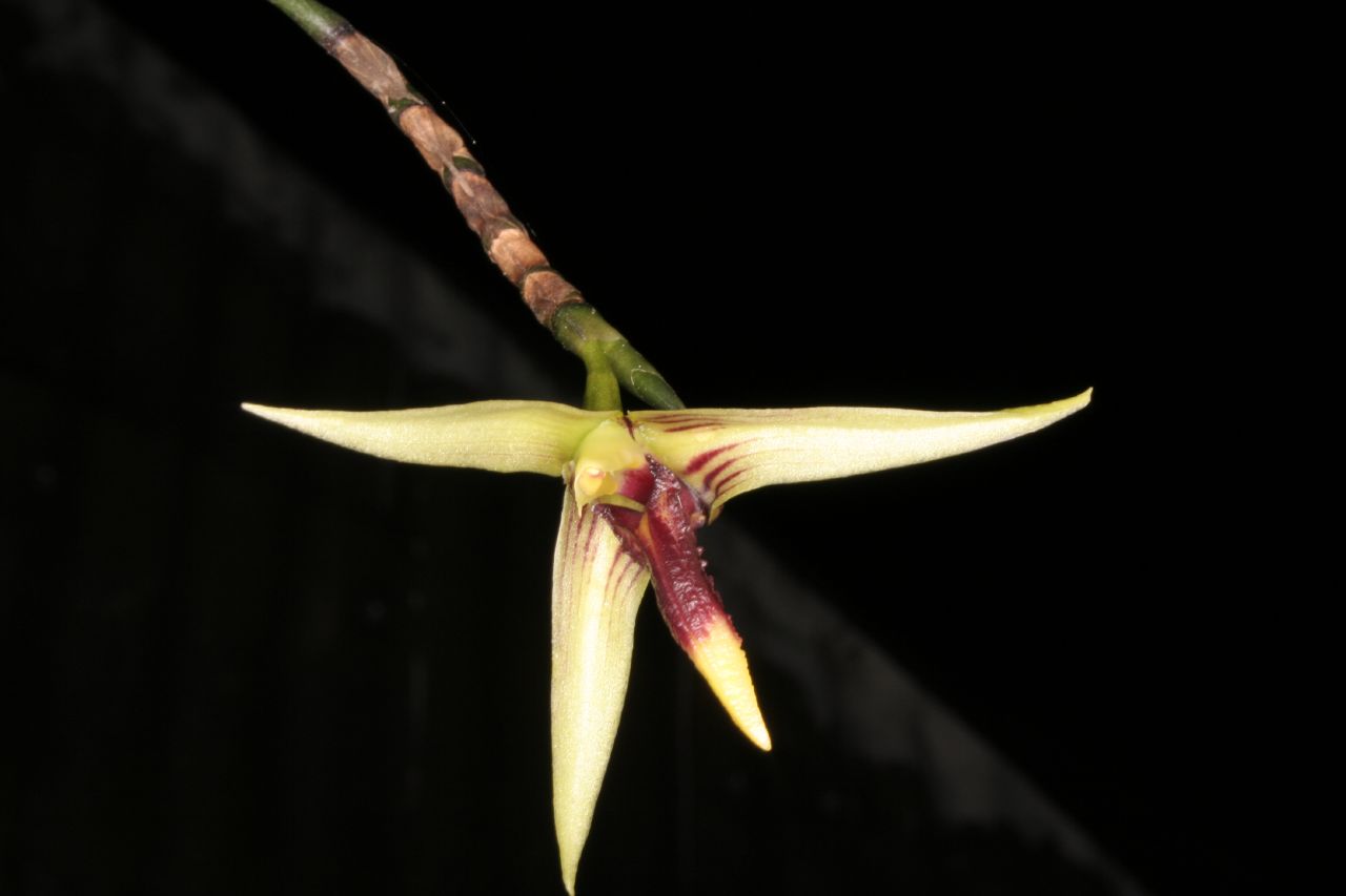 Found in Papua New Guinea, the Solomon Islands to Tonga, Fiji, Vanuatu and Samoa, as a unifoliate epiphyte at elevations of sealevel to 500 meters in mangrove swamps and open forests with 1 3/43" between the ovoid pseudobulbs carrying the single, apical, linear-oblong, subacute leaf that blooms on a basal, slender, to 28" [80 cm] long inflorescence with a few sequentially opening flowers on a short expanding rachis occuring over several months. This species requires a moisture holding medium in a large pot, hot temperatures, partial shade and ample water and fertilizer.
