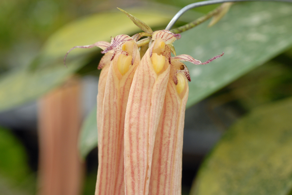 Found in Thailand, Myanmar, Borneo and Malaysia at lower elevations as a small sized, hot to warm growing epiphyte with conical, sheathed pseudobulbs carrying a solitary, apical, oblong, coriaceous, subsessile leaf that blooms in the spring on a erect or pendant, 8" [20 cm] long inflorescence from which arises a 5 to 10 flowered, apical umbel of short-lived, fragrant flowers.