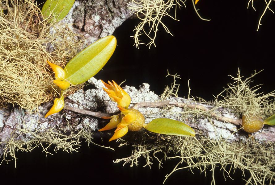 Found in northern Sumatra in lichen rich evergreen forests at elevations around 1500 meters as a mini-miniature sized, cool growing epiphyte with a long creeping, rather thin, branchiong rhizome with 2 to 4" [5 to 10 cm] between each broadly ovoid, olive green pseudobulb carrying a single, apical, oblong to ovate, thick, fleshy, obtuse, shortly bilobed apically, petiolate base leaf that blooms in the winter on an erect, from the nodes of the rhizome, very short, to 4 flowered inflorescence covered by loose tubular sheaths.
