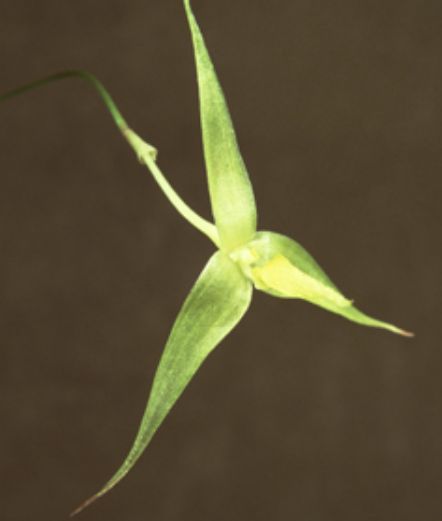 Found in eastern New Guinea in primary forests at elevations around 2200 to 2300 meters as a mini-miniature sized, cold growing epiphyte with a creeping rhizome with .4 to 1.4" {1 to 3.5 cm] between each ovoid to lenticular, not to hardly flattened pseudobulb carrying a single, apical, elliptic to ovate, acute apically, shortly petiolate base leaf that blooms in the summer on a single, patent to pendulous peduncle .52 to 2.2" [1.3 to 5.5 cm] long, with 3 bracts, 1.6 to 3.6" [4 to 9 cm] long overall, rachis single flowered inflorescence with tubular, acute apically, much shorter than the ovary floral bracts and carrying moderately opening flowers with yellowish green tepals with or without purple veins and a yellow lip.