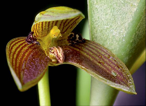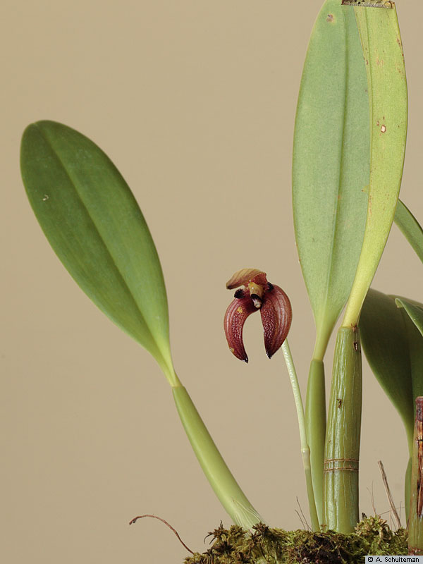 Found in New Guinea in lowland forests at elevations around 440 meters as a small sized, hot growing epiphyte with a creeping, elongate, terete, branched rhizome giving rise to erect, 1.2" [3 cm] between each, elongated, compressed, linear, in cross-section obtusely subquadrangular, longitudinally grooved pseudobulb carrying a single, apical, erect, lanceolate, obtuse, apiculate, thickly coriaceous, margins recurved, apex recurved, acute, midrib above grooved, underneath prominent, obtuse, narrowing below into a short, stout, conduplicate-channelled, c. .4 to .6" [1 to 1.5 cm] long petiolate base leaf that blooms in the late winter and early spring from the nodes of the rhizome, peduncle pale green, c. .8" [2 cm] long, single flowered inflorescence with appressed, tubular, acute, keeled above, shorter than the ovary floral bracts and carrying color variable flowers.
