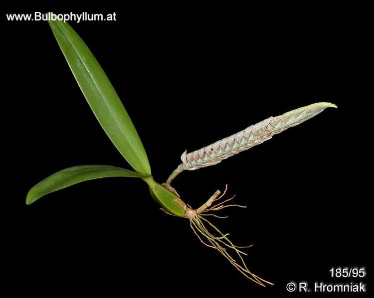 Found in Guinea, Ivory Coast, Nigeria, Sierra Leone, Togo, Congo, Zaire, Ethiopia Zambia in riverine forests at elevations of 1000 to 1700 meters as a small to medium sized, warm to cool growing epiphyte or lithophyte with 1.2 to 5.2" [3 to 13 cm] between each, ovoid to ellipsoid, slightly compressed, sharply 4 angled pseudobulbs carrying a single to two, lanceolate, to linear-lanceolate, obtusely emarginate, apically gradually narrowing below into the shortly petiolate base leaves that blooms in the fall and winter on an erect, slightly flattened, to 6 to 15.2" [15 to 38 cm] long, 28 to 68 flowered inflorescence with tufted hairs and enveloped below by 10 scarious sheaths and large, scarious, imbricate, triangular, grey-purple with some fine dark hairs, recurved, longer than the flowers floral bracts and carrying distchous, several opening together, not widely opening flowers.