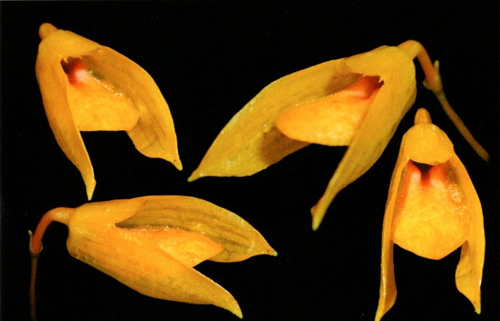 Found in Sabah Borneo moss and lichens on trees at elevations around 1930 meters as a mini-miniature sized, cool growing epiphyte with a creeping rhizome with .2" [5 mm] between each erect, subglobose to ovoid, often somewhat angular, obtuse pseudobulb enveloped by a evanescent basal sheath soon becoming bristles and carrying a single, apical, erect, elliptic, green, leathery, obtuse, unequally bilobed, abruptly narrowing below into the petiolate base leaf that blooms in the summer on a from the rhizome at the base of the pseudobulb, erect, peduncle .88 to 1" " [2.2 to 2.5 cm] long, red brown, provided with 2 basal bracts, the inner one large and enveloping the peduncle, 1 to 1.2" [2.5 to 3 cm] long overall, single flowered inflorescence with ovate, acute, much shorter than the ovary floral bracts.