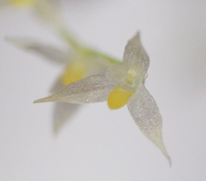Found in eastern New Guinea in primary forests and shrubby secondary open forests at elevations around 1600 to 1800 meters as a small sized, cool growing epiphyte with a patent to pendulous rhizome with .4 to 1.54" [1 to 3.8cm] between each ovoid to cylindrical, not to hardly flattened pseudobulb carrying a single, apical, ovate to elliptic, acute apically, shortly petiolate base leaf that blooms in the winter and spring on a single, peduncle .28 to .6" [.7 to 1.5 cm] long, with 3 bracts, .8 to 2.4" [2 to 6 cm] long overall, rachis erect, .52 to 2.12" [1.3 to 5.3 cm] long, simultaneously 4 to 7 flowered inflorescence with ovate to triangular, acute apically floral bracts and carrying moderately opening flowers with white or pale yellowish tepals and a yellow lip .