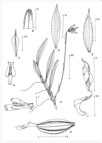 Found in western New Guinea in subalpine grasslands at elevations around 3650 meters as a miniature sized, cold growing terresrial with a thick, creeping, branched rhizome enveloped by large sheaths and giving rise to glabrous, slightly apart, subparallel to rhizome with the apical part curving outwards, narrowly ovoid-cylindric pseudobulbs provided at the base with several glabrous, broadly ovate, acute, nerved bracts and carrying a single, apical, erect, coriaceous, glabrous, elliptic-spathulate, acute, midrib grooved above, prominent below, 5 lateral nerves on either side of midrib, prominulous above, prominent below, margin slightly revolute, papillate in apical part leaf that blooms in the later spring on a basal, solitary, peduncle glabrous, 4.8 to 6" [12 to 15 cm] long, provided at the base with a tubular, obliquely truncate, acutish, glabrous, with a shorter one above the middle, single flowered inflorescence with shorter to longer than the ovary floral bracts.