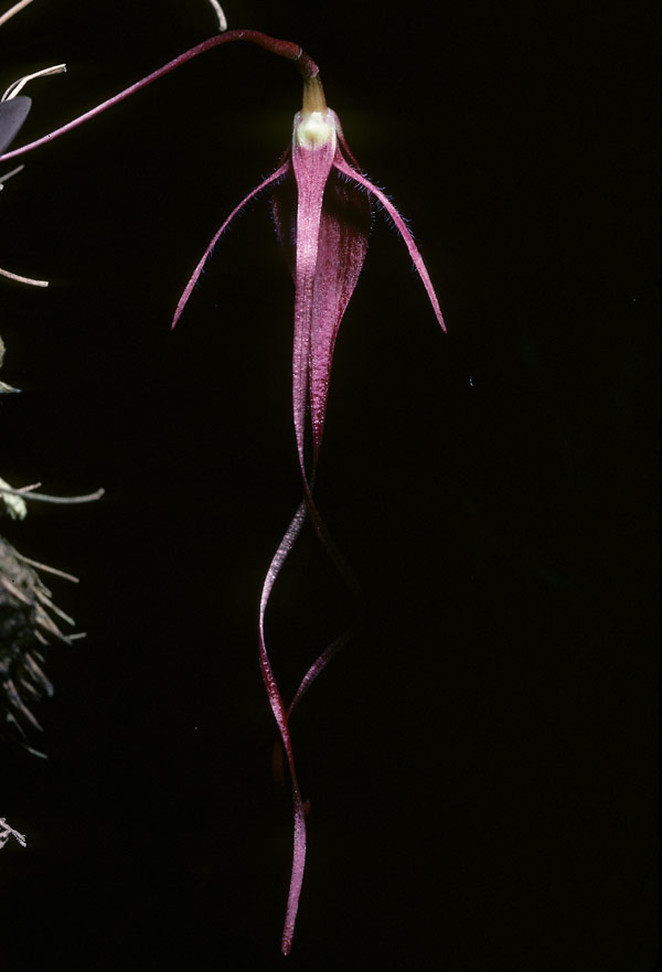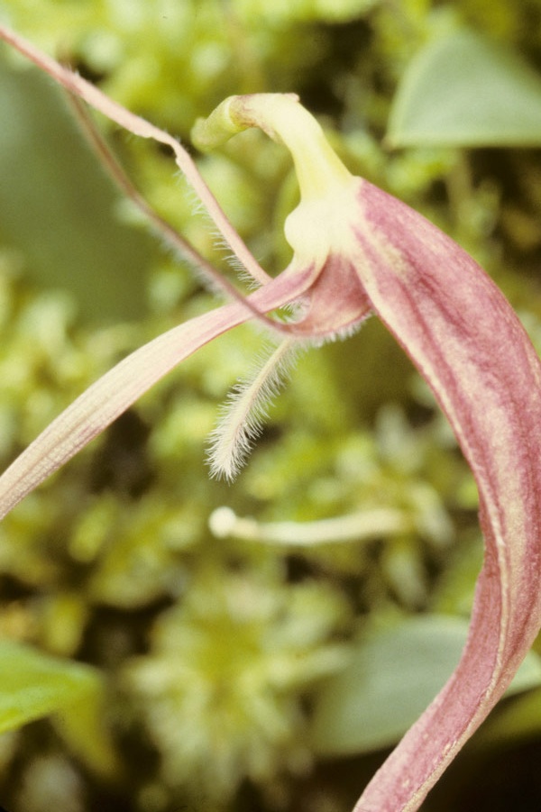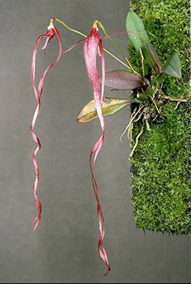Found in Papua New Guinea in montane forests at elevations of 1500 to 2700 meters as a mini-miniature sized, cool to cold growing epiphyte with close set, truncate-elliptic, in coss-section subrotund pseduobulbs carrying a single, apical, narrowly ellipsoid leaf that blooms in the fall and winter on a basal, peduncle very thin, 3.2” [8 cm] long, single flowered inflorescence with membranous, enclosing and densely appressed to the ovary floral bracts