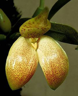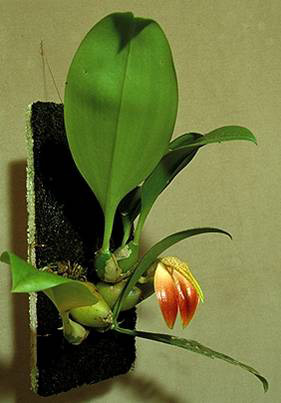 Found in Papua New Guinea in lowland forests on river banks and stream sides on trees at elevations around 200 to 300 meters as a small sized, hot growing epiphyte with a creeping, short rhizome giving rise to close set, ovoid, about terete, glabrous pseudobulbs carrying a single, apical, erect, oblong, acuminate, coriaceous, glabrous, narrowing below into a short, petiolate base leaf that blooms in the spring on a short, enveloped by peduncle scales, single flowered inflorescence with ovate, acuminate, much shorter than the ovary floral bracts.