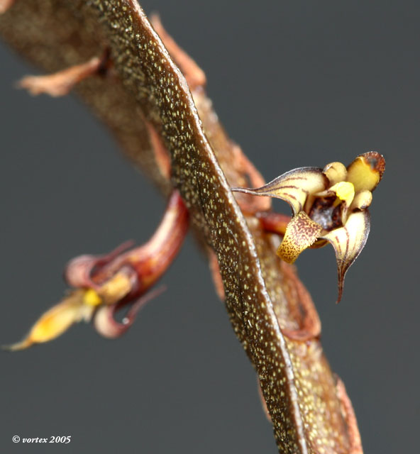 Found in Sierra Leone, Ivory Coast, Ghana, Togo, Liberia, Nigeria, Gabon, Gulf of Guinea Islands, Cameroon, Central African Republic, Zaire, Uganda, Kenya, Ethiopia, Tanzania, Mozambique, Malawi, Zambia, Zimbabwe and Angola as a miniature sized, hot to warm growing, bifoliate epiphyte and an occasional lithophyte in open woodlands and riverine forests at elevations of 600 to 2100 meters with oblong to ovoid pseudobulbs carrying to 3, apical, oblong, apex rounded and emarginate thick and leathery leaf that blooms in the fall on a single, basal, erect, 20" [50 cm] and more long inflorescence arising on a mature pseudobulb with many [50], small, successive opening, musky scented flowers spread out along the leaflike, flattened rachis with dentate edges.