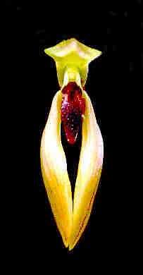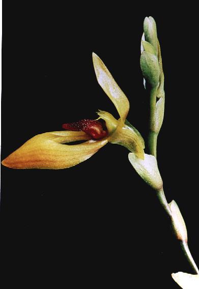 Found in Sulawesi and the Philippines as an small sized, epiphyte around elevations of 900 meters with 1/2" between each cylindrical, tapering, non angular pseudobulbs carrying a single, apical, leathery, elliptic to obovate, channeled below into the 1.6 to 2.4" [4 to 6 cm] long, petiolate base leaf that blooms in the spring on an erect to patent, lax, 22" [55 cm] long, successively single few [6] flowered inflorescence that has several, funnel shaped bracts.