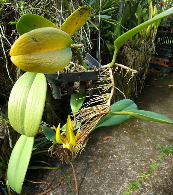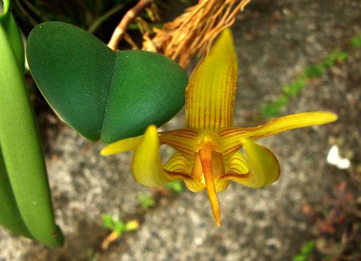 Found in penninsular Malaysia, the Moluccas and the Philippines at elevations up to 550 meters as a small sized, hot to warm growing epiphyte with 4" [10 cm] between each, small pseudobulb carrying a single, apical, erect, leathery, elliptic, petiolate base leaf that blooms on an erect, basal, to 2.6" [6.5 cm] long, single flowered inflorescence carrying a non resupinate flower that has a sweet scent.