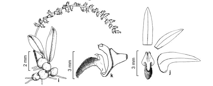 Found in Espirito Santo, Minas Gerais, Rio de Janiero and Parana states of Brazil as a mini-miniature sized epiphyte with close set, ovoid-conical, tetragonal pseudodbulbs carrying a single, apical, erect, coriaceous, elliptic-oblong, acute, narrowing below into the base leaf that blooms in the fall on a basal, erect, 3.2" [8 cm] long overall, laxly many flowered inflorescence.