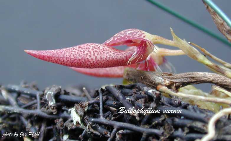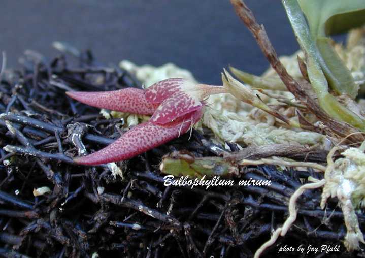 References W3 Tropicos, Kew Monocot list , IPNI ; Orchidaceae of German New Guinea Schlechter 1913; Notes on Cirrhopetalum Seidenfaden 1973 drawing fide; Orchid Digest Vol 48 No 2 1984 photo fide; Orchids of Java Comber 1990 as B mirum; The Orchids of Penninsular Malaysia and Singapore Seidenfaden & Wood 1992 drawing fide; A Checklist of the Orchids of Borneo Wood & Cribb 1994; Orchids of Sumatra Comber 2001 as B mirum; Bulbophyllum and Their Allies Seigerist 2001 as Rhytionanthos mirum; Rudolf Schlechter Die Orchideen Band 1C lieferung 42 - 43 pg 2626 - 2762 Brieger 2001 as Rhytionanthes mirum photo fide; Australian Orchid Review Vol 70 No 5 2005; Gard. Bull. Singapore 57: 133-137 J J Verm & P O'Byrne 2005 photo fide; Malesian Orchid Journal Vol 7 2011 drawing/photo fide; Wild Orchids of Penninsular Malaysia Ong, O'Byrne, Yong & Saw 2011 photo fide; A Compendium of Miniature Orchid Species Gerritsen and Parsons 2013 photo fide;