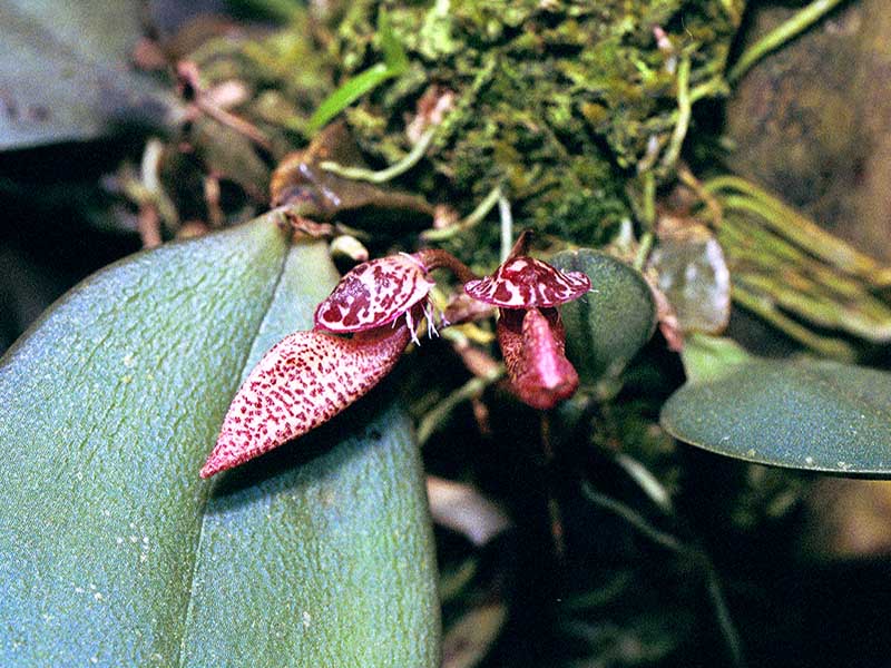 Found in Sabah Borneo, Sumatra, Java, Flores, Bali and penninsular Malaysia on mossy branches and trunks at elevations around 1000 to 1600 meters as a mini-miniature to miniature sized, cool growing epiphyte with a slow creeping, branching rhizome with 1" [2.5 cm] between each shortly ovoid to conical, acutely quadrangular, shiny olive green pseudobulbs carrying a single, oval to oblong, abruptly narrowing below into the very short petiolate base leaf that blooms in the summer on a basal, 5/8" to 1.1" [1.5 to 2.6 cm] long, simultaneously 2 flowered inflorescence carrying resupinate flowers