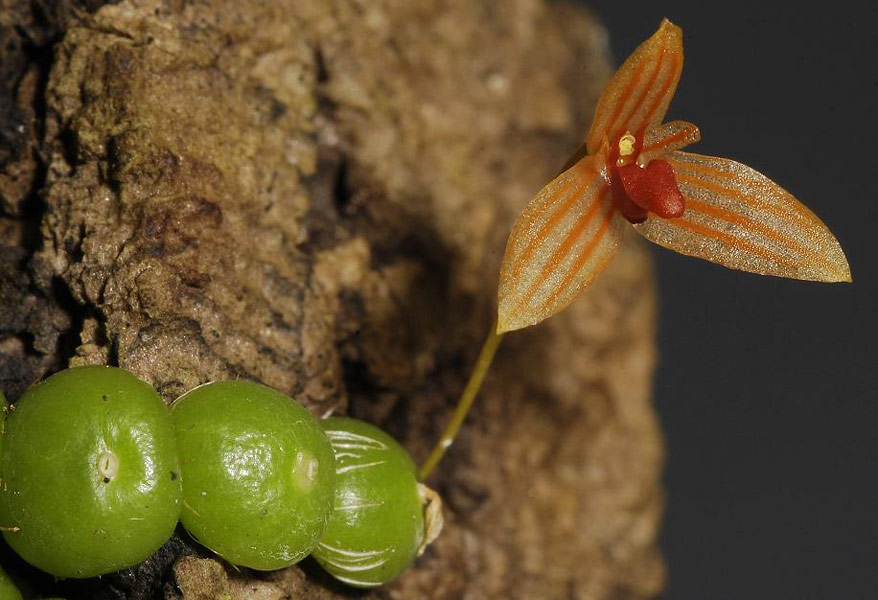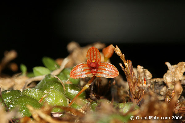 Found in Laos, Cambodia, Vietnam, India, Myanmar and Thailand as a mini-miniature sized, hot to warm growing epiphyte or occasional lithophyte at elevations around 20 to 800 meters with very small, wrinkled, round, glossy green pseudobulbs in clusters with a single, apical, tiny, deciduous, erect, fleshy, oblong-elliptic, acute, apiculate, sessile base leaf that blooms in the fall and winter after leaf-fall on an erect to suberect, basal, laterally, 3/4" [2 cm] long, single flowered inflorescence holding the flowers above the leaf.
