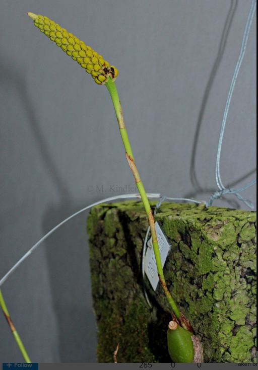 Found in central eastrern Madagascar in humid, evergreen forests on plateau at elevations of 100 to 1300 meters as a medium sized, hot to cool growing epiphyte with 1.6" [4 cm] between each cylindrical-conical, 4 angled pseudobulb carrying 2, apical, oblong-ligulate, obtuse, slightly attenuate towards the base leaves that blooms in the later spring on an erect, rigid, peduncle provided with 4 to 5 sheaths, rachis 2.8" [7 cm] long, 16" [40 cm] long overall, cylindrical densely many flowered inflorescence withoval, obtuse, lower ones almost as long as the flowers floral bracts..