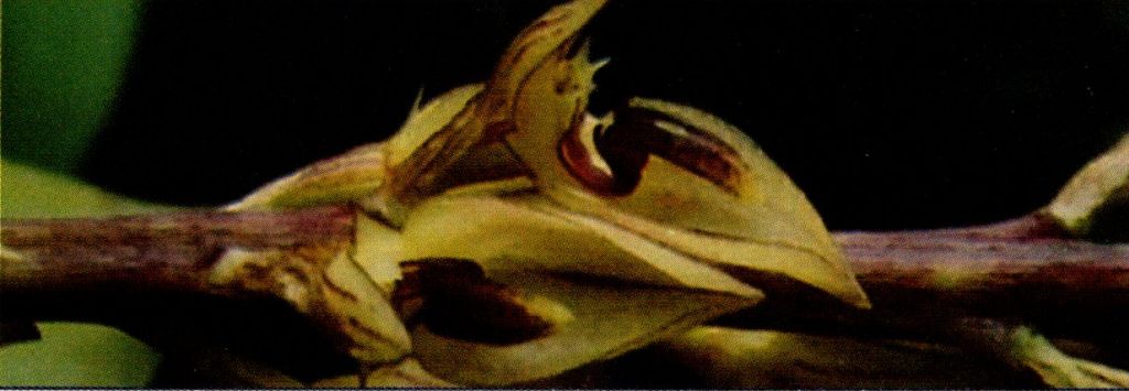 Found in Colombia?, Venezuela and Bolivia in subtropical forests as a mini-miniature sized, warm growing epiphyte with a terete, repent rhizome giving rise to slightly distant, hard, green red, hershy’s Kiss shaped, sometimes slightly adpressed to the rhizome ppseudobulbs carrying a single, apical, erect, subterete, sulcate, blue green, narrowly lanceolate, acute leaf that blooms in the early summer on a lateral, basal, peduncle with 6 to 8 tubular, subremote bracts, erect and arching at the midportion of the rachis, to 4.4 [to 11 cm] long, 20 to 24 flowered inflorescence.
