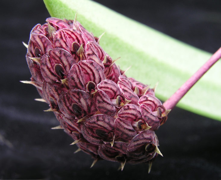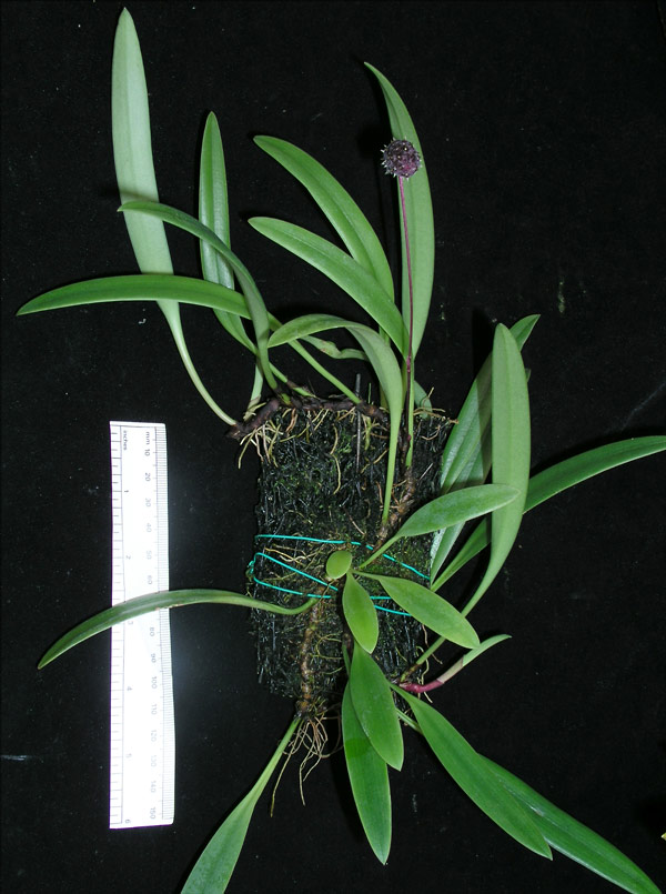 Found in southern Sumatra on Mt Dempo at elevations around 1400 meters as a small sized, cool growing epiphyte with a creeping, terete rhizome with .72 to .8" [1.8 to 2 cm] between each, erect, disc-shaped, smooth, green pseudobulb carrying a single apical, erect, shiny green above, dull green beneath, linear, acute, narrowing below into the 1.6 to 2.4" [4 to 6 cm] long, petiolate base leaf that blooms on a basal, erect, longer than the leaf, peduncle terete, thickened at the apex, dull purple, 6 to 6.4" [15 to 16 cm] long, rachis nodding, many angled, to 1.5" [3 cm] long, 7.2 to 7.6" [18 to 19 cm] long overall, apically densely many flowered inflorescence.