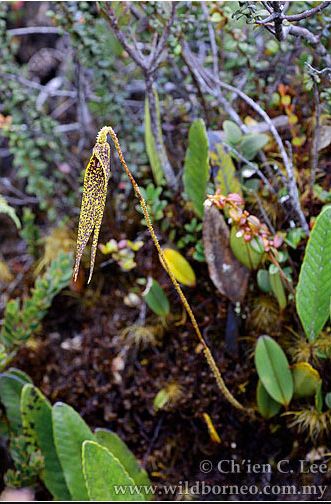 Found in Papua New Guinea in upper montane scrub and subalpine grasslands at elevations of 1900 to 3250 meters as a mini-miniature sized, cold growing epiphyte with purple to green, well spaced, narrowly ovoid-cylindric to ovoid, sometimes curved, erect pseudobulbs and carrying a single, apical, erect, coriaceous, green above, shiny purple beneath, elliptic to oblong-elliptic, rounded to obtuse, sometimes apiculate, midribbed, grooved above, prominent beneath, 4 to 5 laterally nerved, slightly revolute margined leaf that blooms in the spring through earlier fall on a basal, erect, 6 to 20" [15 to 50 cm] long, subdensely reddish to brown papillate-warty with numerous, claviform, pendulous appendages on the internodes, single flowered inflorescence with 2 to 3, basal, glabrous, tubular bracts and 2 to 3, similar bracts higer up.