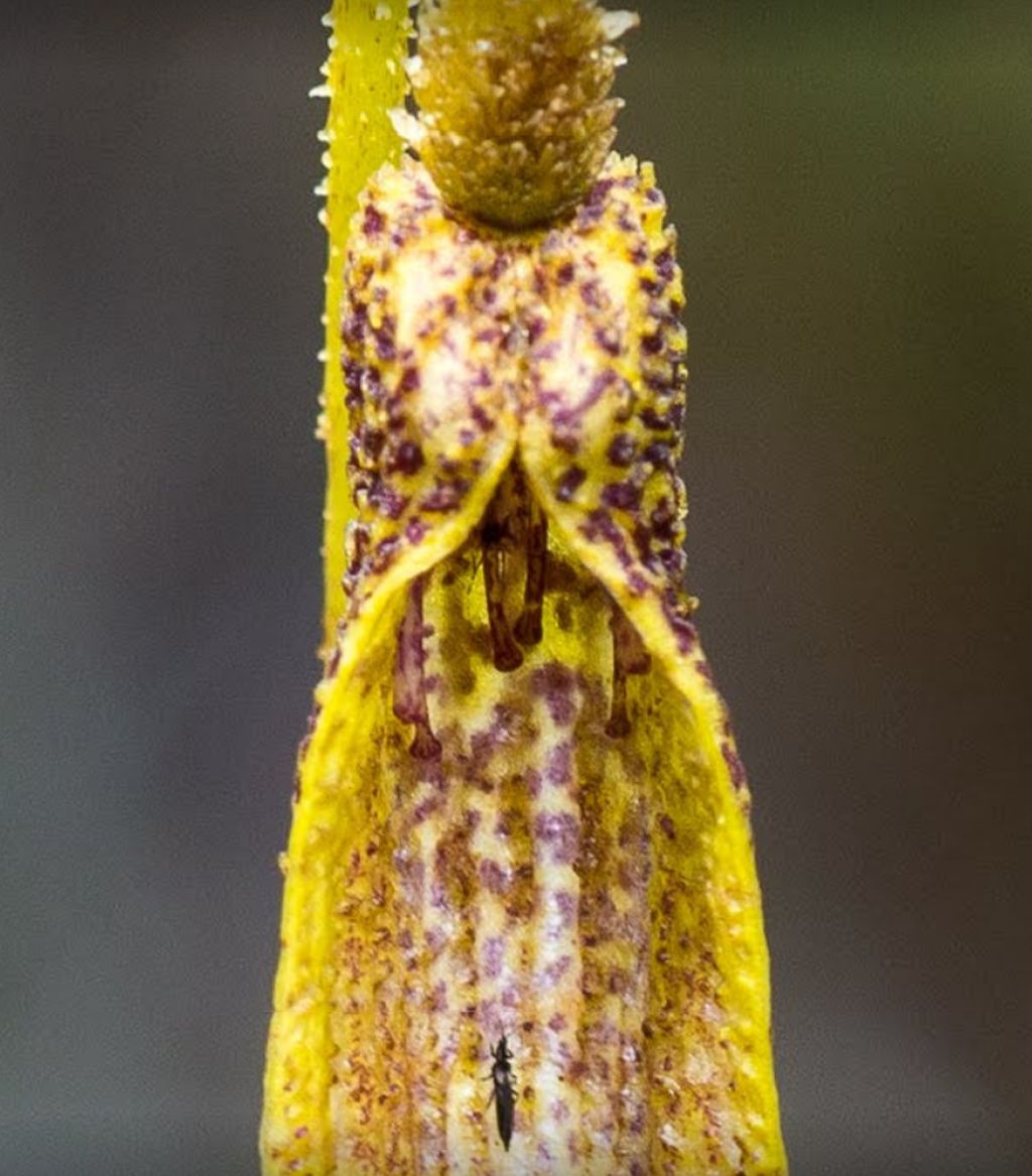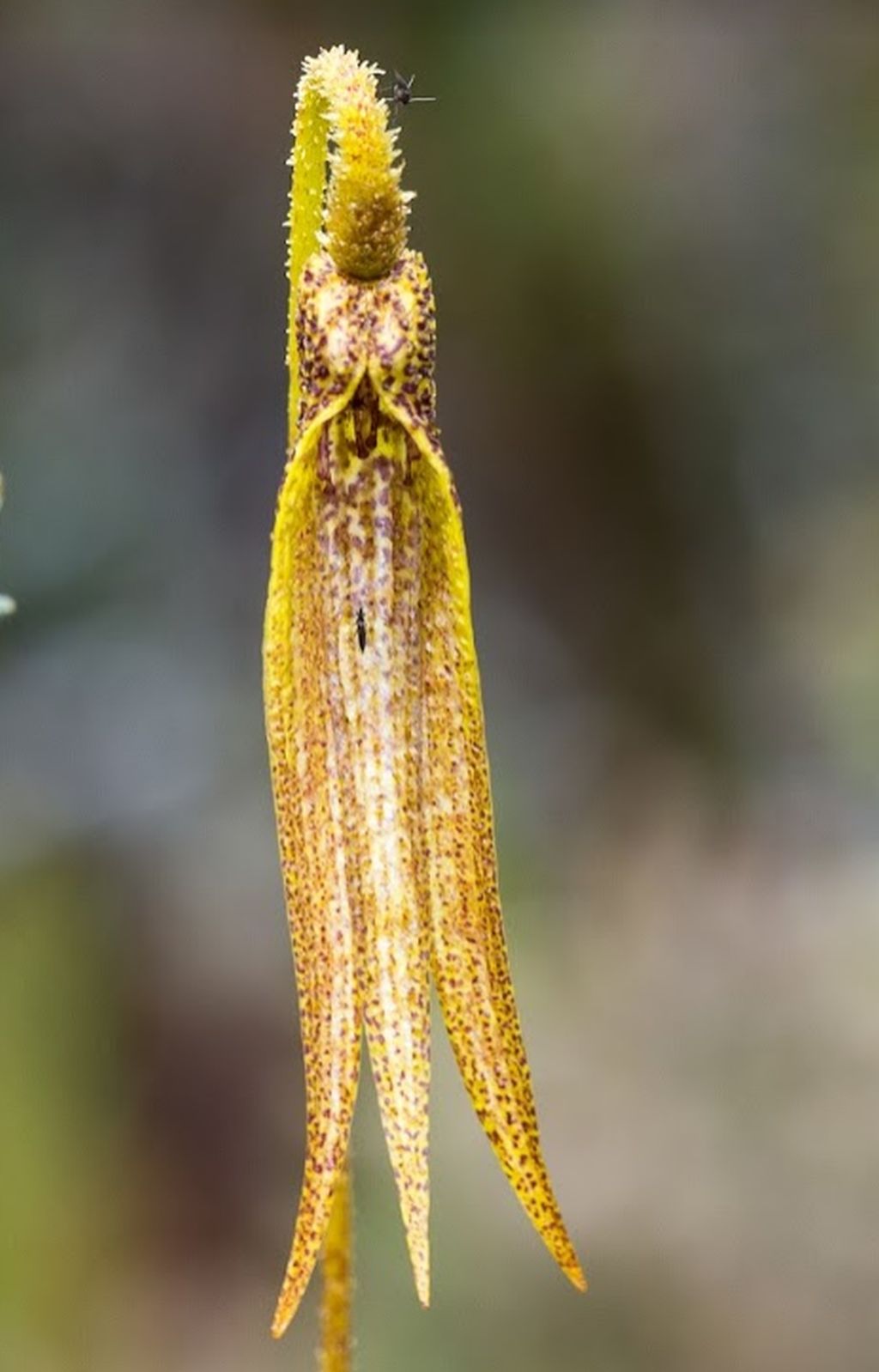 Common Name The Point Covered Bulbophyllum [refers to the warty appendages on the inflorescence, pedicel and flower]