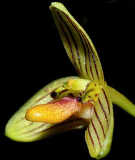 Found in New Guinea on trees in range forests at elevations around 1200 meters as a miniature to just small sized, cool growing epiphyte with ovoid pseudobulbs carrying a single, apical, erect, ligulate, minutely apiculate, narrowing below into the petiolate base leaf that blooms in the late fall and early winter on an erect, .8" [2 cm] long, single flowered inflorescence.