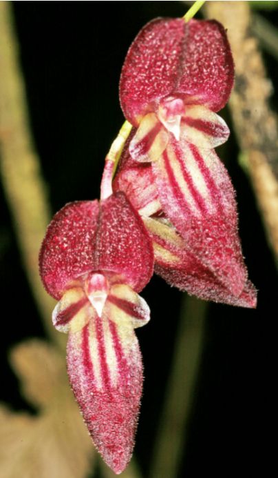 Found in Papua New Guinea in disturbed primary forests at elevations around 1800 to 3000 meters as a mini-miniature plant to large sized in length, pendulous, cool to cold growing epiphyte with a pendent rhizome with .72 to 2.6" [1.8 to 6.5 cm] between each ovoid to somewhat cylindrical, not flattened pseudobulb carrying a single, apical, ovate, acute to acuminate apically, shortly petiolate base leaf that blooms in the summer, fall and spring on a single, peduncle 1.4 to 2" [3.5 to 5 cm] long, with 3 bracts, .8 to 4" [2 to 10 cm] long overall, rachis pendulous, .28 to 2" [.7 to 5 cm] long, simultaneously 2 to 8 flowered inflorescence with ovate, acute apically floral bracts and carrying moderately opening flowers with creamy yellow sepals often with purple veins and an entirely purple apex, petals cream colored often with a purple vein, lip yellowish often suffused with purple,