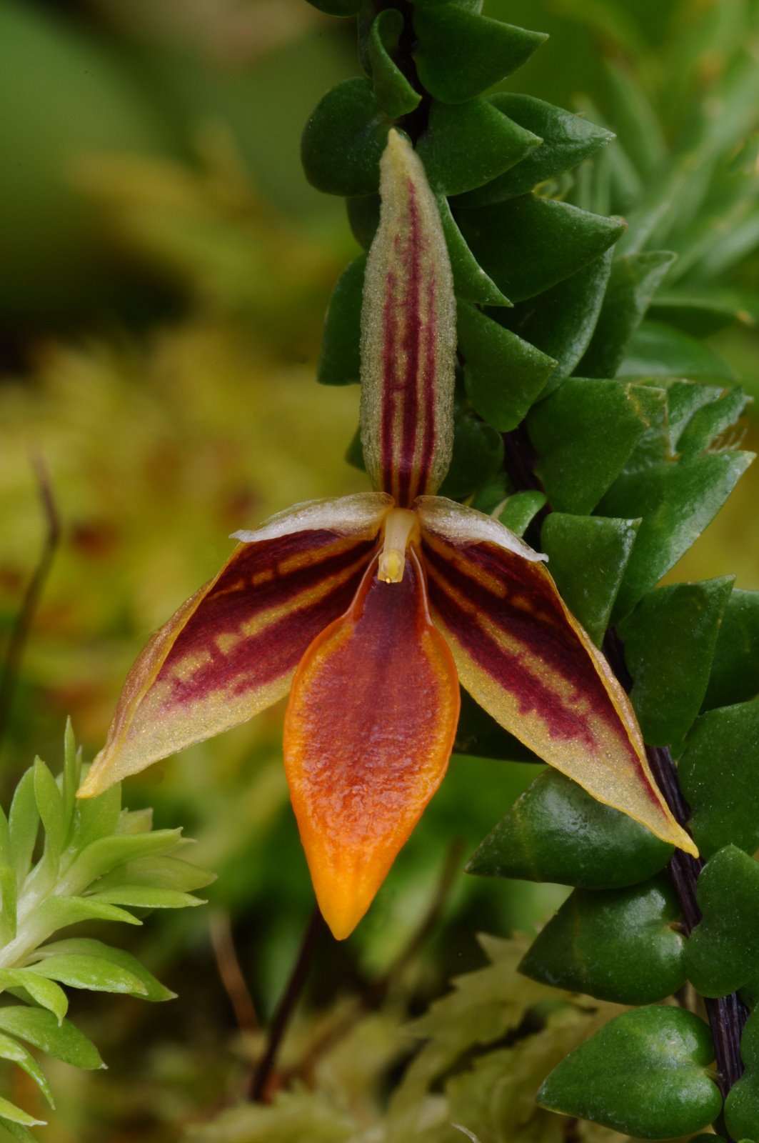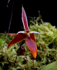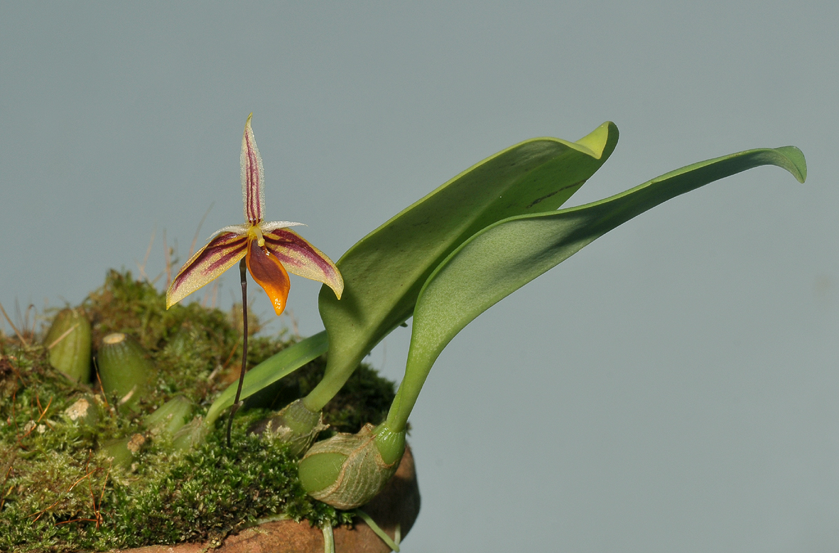 Found in Western New Guinea in hill forests at elevations of 450 to 600 meters as a mini-miniature sized, hot to warm growing epiphyte with a rather short, creeping, sparsely branching rhizome giving rise to obliquely ovoid, .08 to .28" [2 to 7 mm] between each, longitudinally grooved with age, light green, becoming dull purple with age pseudobulbs carrying a single, apical, elliptic, coriaceous, apex rounded, abruptly acute, ull bluish green, paler green underneath, channeled below into the petioalte base leaf that blooms in the spring on a basal, erect, peduncle very thin, 1.6 to 2.4" [4 to 6 cm] long, glabrous, deep red-purple, consisting of two internodes, the basal internode much shorter than the upper internode, provided with tubular, oblique peduncular scales, 2 to 2.8" [5 to 7 cm] long overall, single flowered inflorescence with tubular, oblique, shorter than the ovary floral bracts.