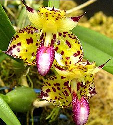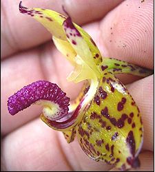 Found in Sabah Borneo in podosol forests in deep shade at elevations around 490 meters as a small sized, hot growing epiphyte with a creeping rhizome with .6 to 2" [1.5 to 5 cm] between each cylindrical, somewhat flattened, 6 angled pseudobulbs enveloped in youth by a grey sheath becoming fibrous with age and carrying a single, apical, erect, narrowly elliptic, acute to acuminate, attenuate to the slender petiolate base leaf that blooms in the fall on an erect, 3.2 to 4" [8 to 10 cm] long, single to 2 flowered inflorescence with ovate, acute floral bractss