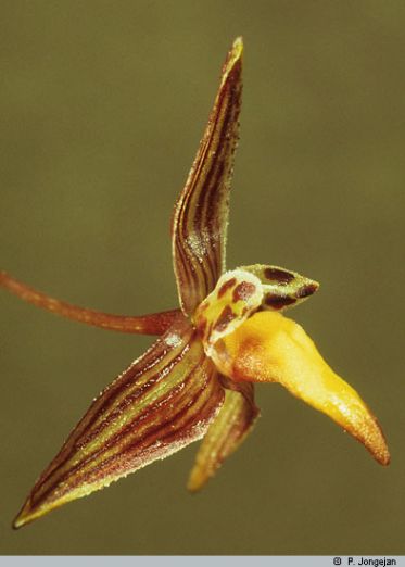 Found in Papua New Guinea in lower montane forests low tree trunks at elevations 1300 to 1400 meters as a mini-miniature sized, cool growing epiphyte with a creeping, new shoot from the basal node of the pseudobulb, provided with thin, withering soon rhizome scales and giving rise to distinct, .32 to .68" " [0.8 to 1.7 cm] apart, ellipsoid to ovoid, hardly angular pseudobulbs carrying a single, apical, elliptic-ovate, apex acute, petiolate base leaf that blooms on a single or a few together, c. 3.2" [8 cm] long, peduncle c. 2" [5 cm] long, provided with c. 4 scales, single flowered inflorescence with shorter than the ovary floral bracts.